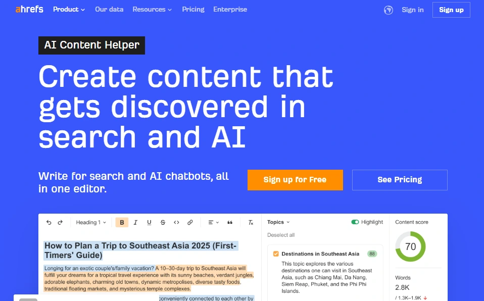 Ahrefs AI Content Helper is a strong add-on if you already live inside Ahrefs and want a simple way to identify topic gaps, improve on-page coverage, and refresh existing pages without jumping between tools.