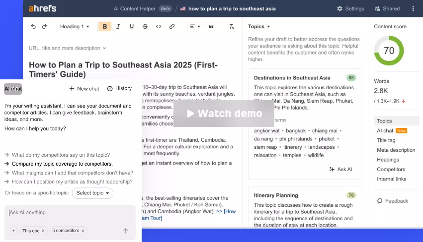 In practical terms, you choose a target keyword, let Ahrefs scan top-ranking pages, then work inside an editor that scores topic coverage, flags content gaps, and suggests improvements in real time. The promise is simple: use AI to create content that lines up with search intent and earns more organic search traffic without guessing what to include.