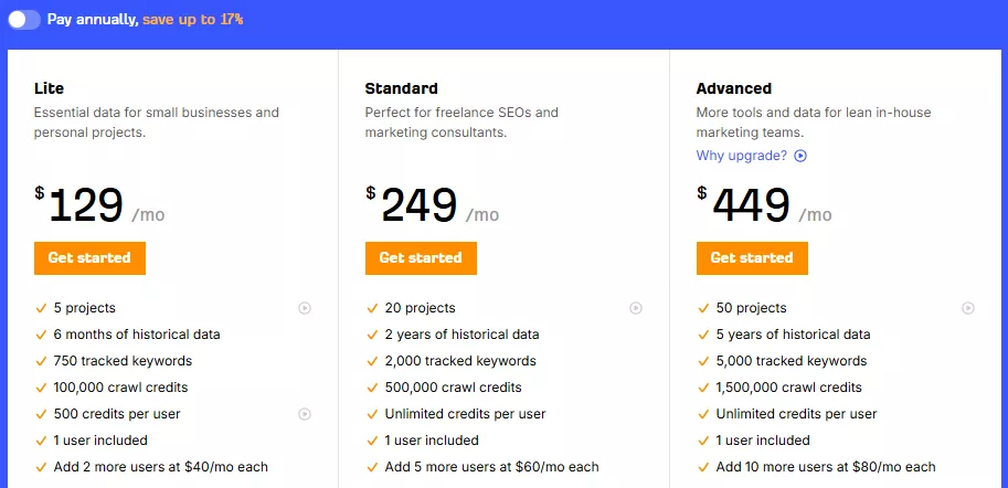 According to the pricing page, core plans start at: Ahrefs
