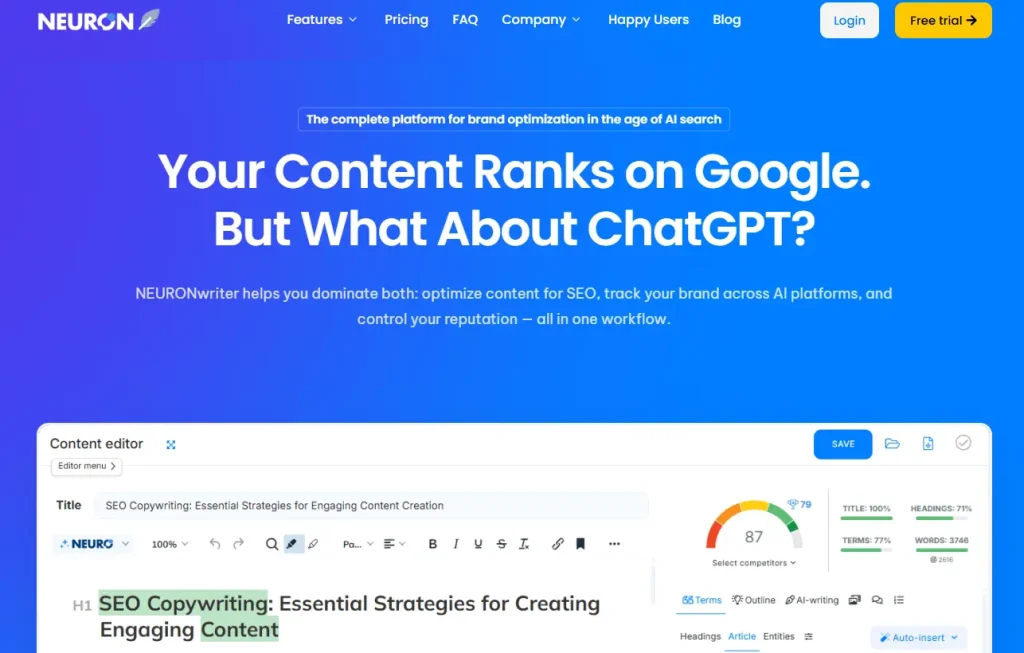 Real optimization depth, not just surface-level suggestions: SERP analysis, semantic coverage guidance, and scoring that helps teams close real gaps without turning content into keyword soup.
