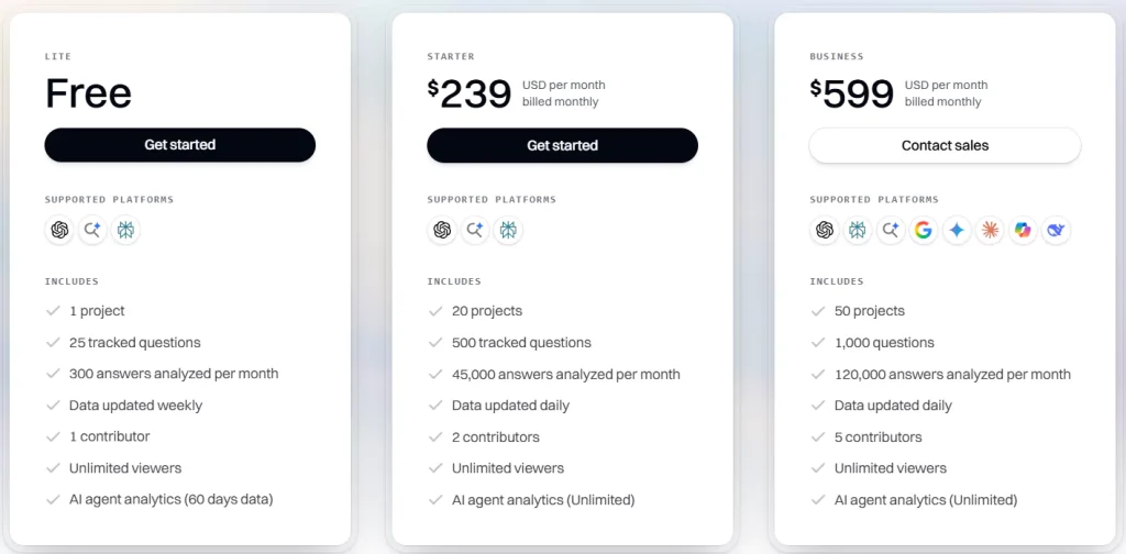 Lite: Free. 1 project, 25 tracked questions, 300 answers/month, weekly data updates, 1 contributor, unlimited viewers, AI agent analytics (60-day data).