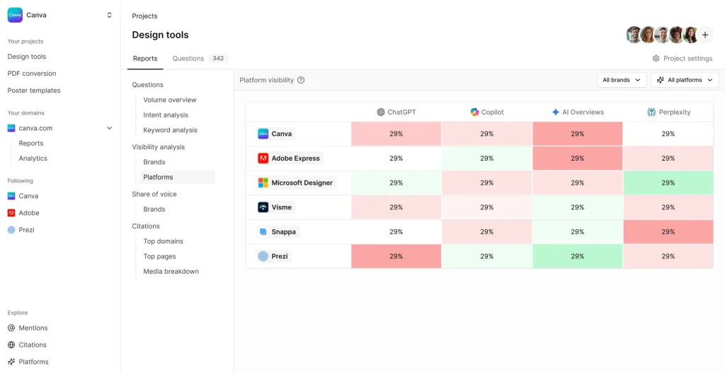 Generative answer insights – See how AI platforms talk about your brand: track visibility, sentiment, and compare against competitors across engines.