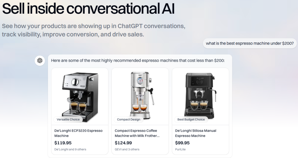 Conversational commerce – Track product visibility in ChatGPT shopping results, measure which questions trigger placements, see retailer citations, and analyze product sentiment.