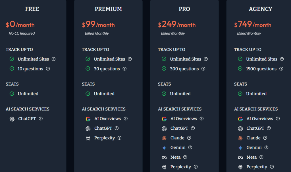 - Premium: $99/month (billed monthly). Unlimited sites, 30 questions, unlimited seats, engines: AI Overviews, ChatGPT, Perplexity; plus AI Search Console, Intent Research, and CSV export.