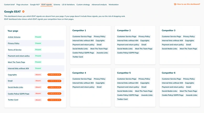 POP includes EEAT auditing features that aim to highlight credibility gaps that could weaken a page’s perceived trust and authority.