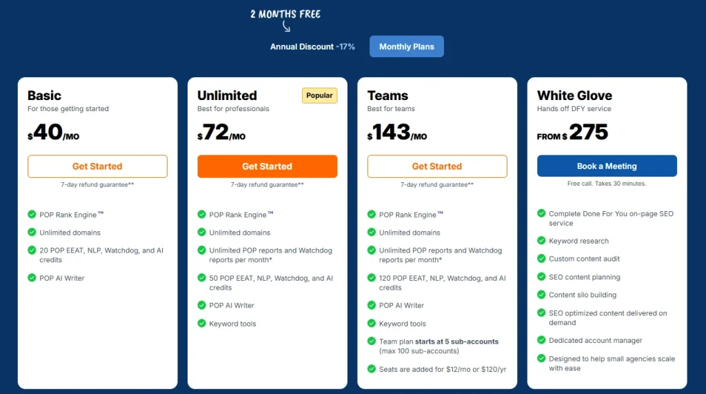 - Unlimited: $72/month (or $62/month billed annually), 50 POP Credits, unlimited POP + Watchdog reports.