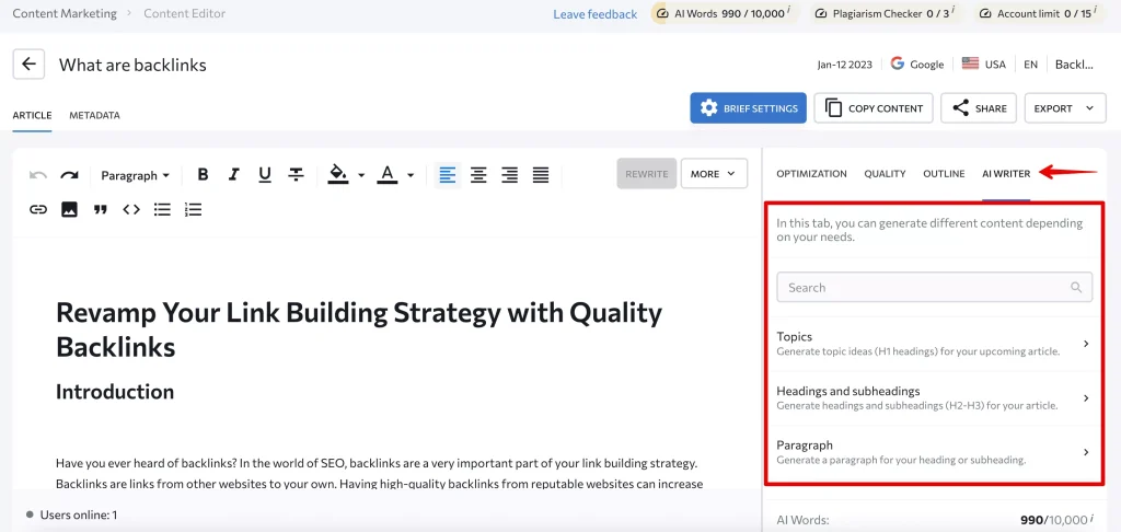 - a step-by-step AI Writer Wizard where you input intent, audience, tone, creativity level, and desired headings or keywords.
