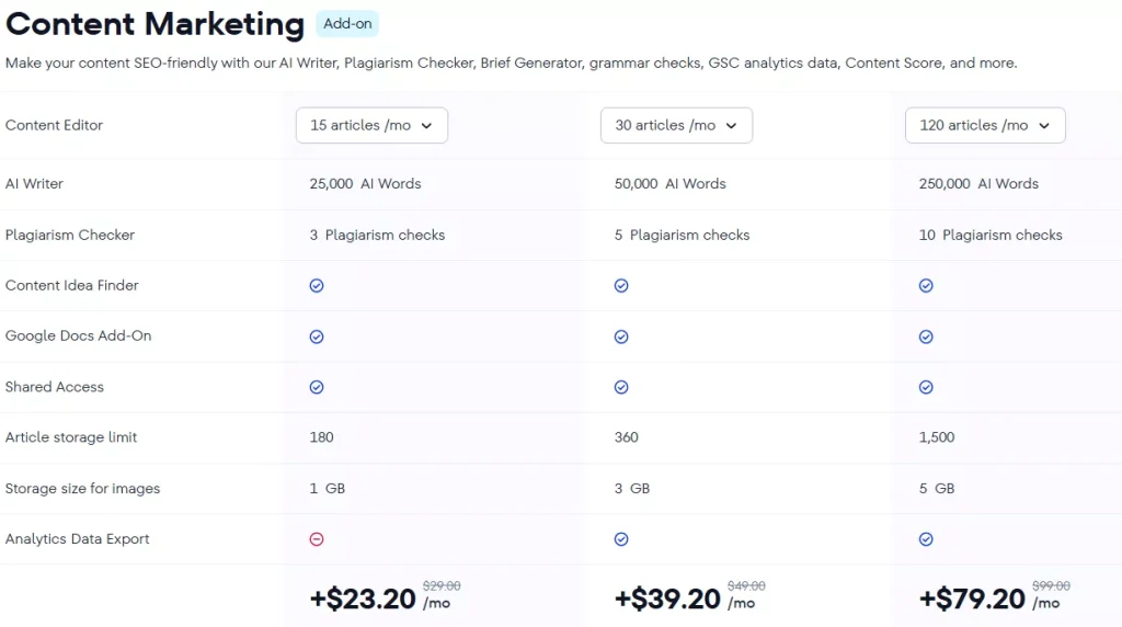 SE Ranking sells Content Marketing as an add-on with tiers. On its pricing page, Content Marketing is described as including AI Writer, Plagiarism Checker, Brief Generator, grammar checks, GSC analytics data, Content Score, and more, with tiers shown at $29/mo, $49/mo, and $99/mo and corresponding limits for “Content Editor articles” (15/mo, 30/mo, 120/mo depending on tier).