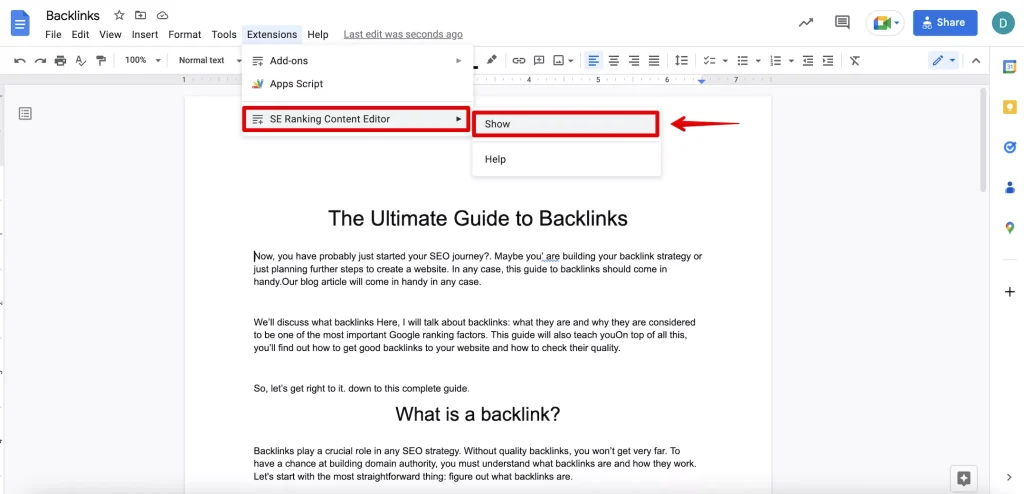 SE Ranking explicitly states its Content Editor integrates with Google Docs to help optimize text “faster and easier,” and that you can export from Content Editor and use the add-on inside Docs.