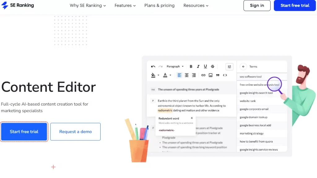 If you’re evaluating SE Ranking for content optimization, you’ll mostly be living inside its Content Editor and the surrounding Content Marketing toolkit.
