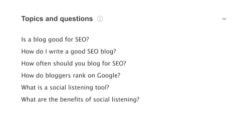 It also surfaces extra competitive insight inside the editor, including page previews, People Also Ask-derived topics/questions, and a word cloud of frequently used terms.
