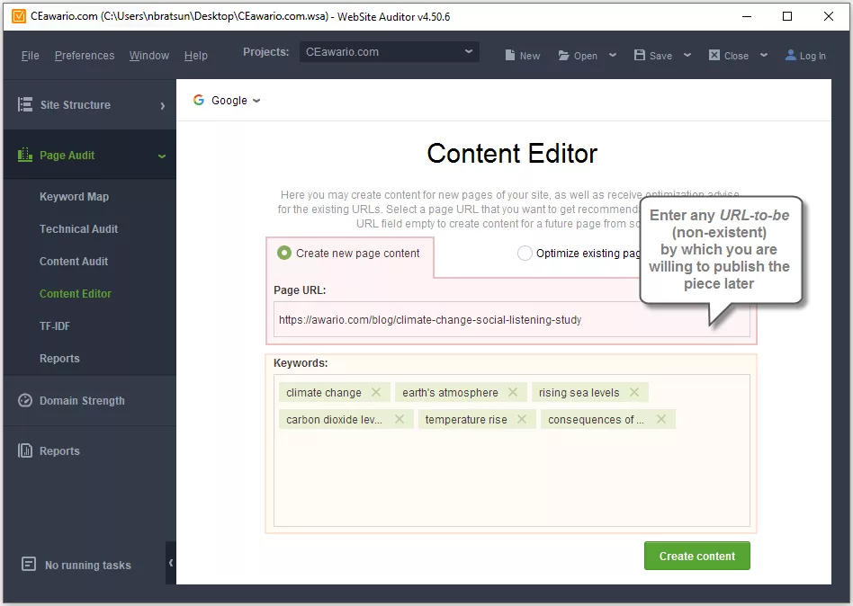 In practice, “SEO PowerSuite content optimization” means using WebSite Auditor’s Content Editor (under Page Audit) to draft or refine page content while benchmarking against competitors across the SERP.