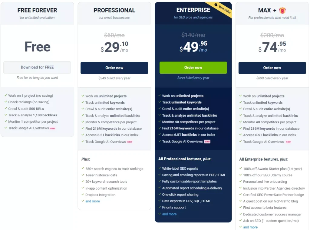 SEO PowerSuite offers a free tier (with limits) and paid tiers that include in-app content optimization.