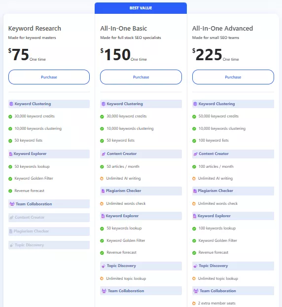 WriterZen’s pricing is “pay once” (one-time purchase), but Content Creator isn’t included in the lowest “Keyword Research” plan. On the pricing page, Content Creator appears greyed out on that plan, indicating it’s not part of that tier.